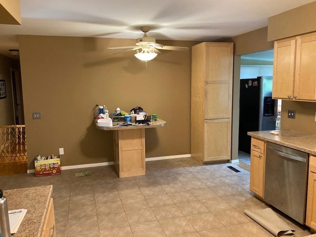 This kitchen had several separate, workspaces and very, very old, inefficient cabinets. Lots of items lived in the basement because there wasn’t appropriately-sized storage space in the kitchen.